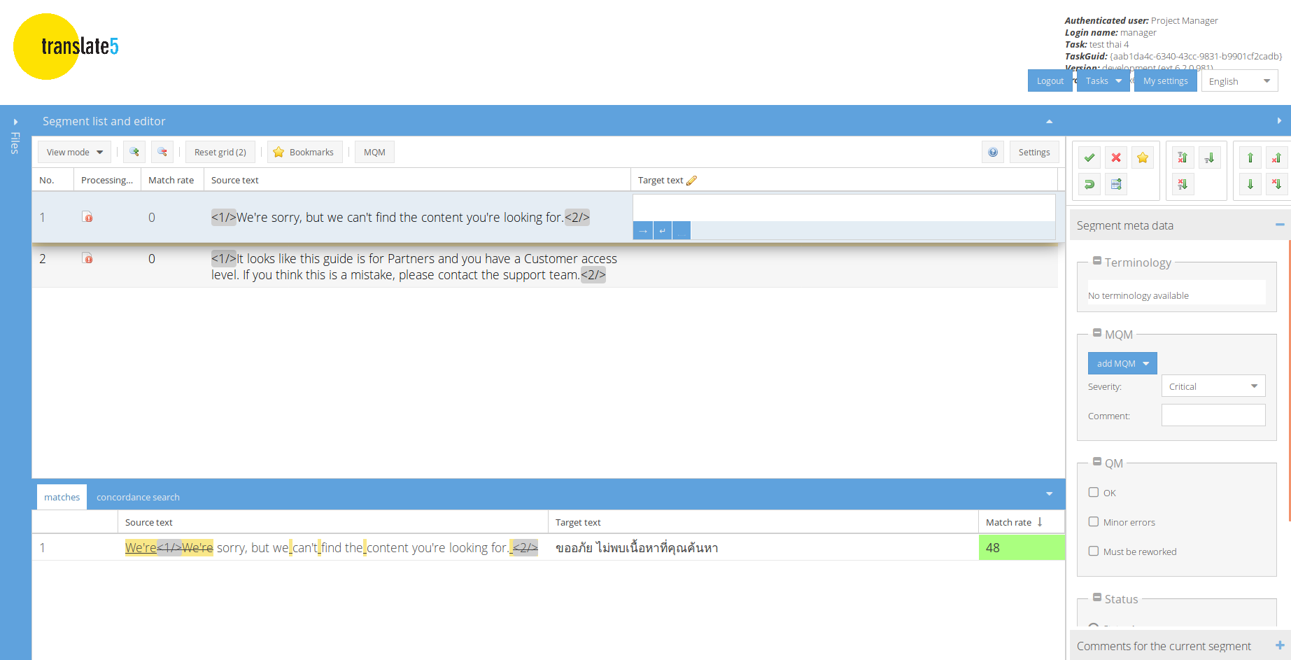 - In the GUI in translate5 the tags from the match disappeared, despite they are in the same position as in the segment (in fact, the segment in the TMX and the xliff is identical, except of the leading and trailing whitespace)