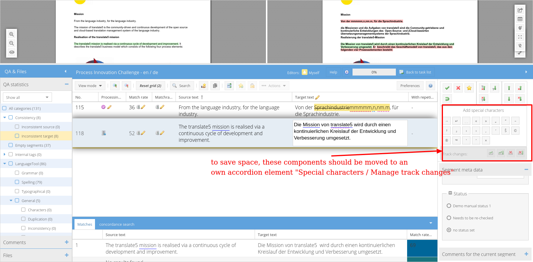 Move "Add special characters" and "TrackChanges" in right column or editor to own accordion