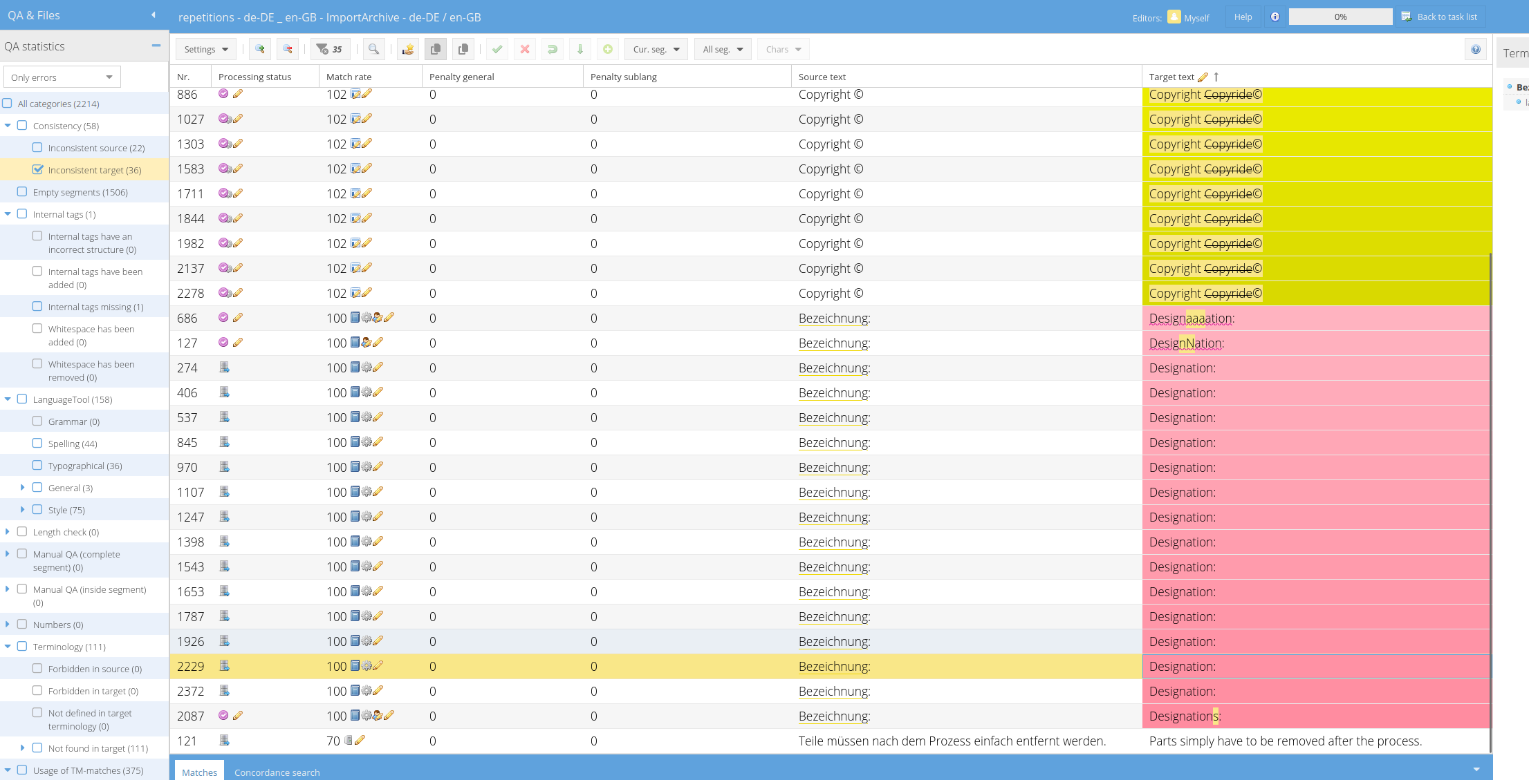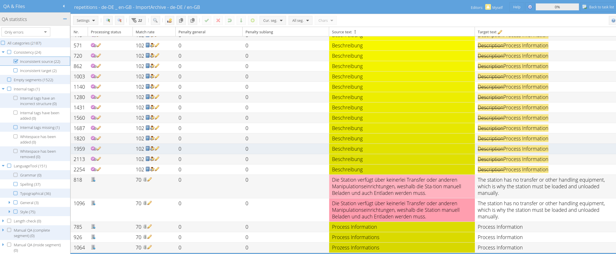 added sorting and background highlighting for inconsistent segments when one of corresponding AutoQA filters is in use