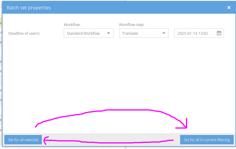 EN: Allows you to change properties of multiple selected projects in a batch operation. Example: Change the delivery date for "Translate" jobs for all checked projects at once.