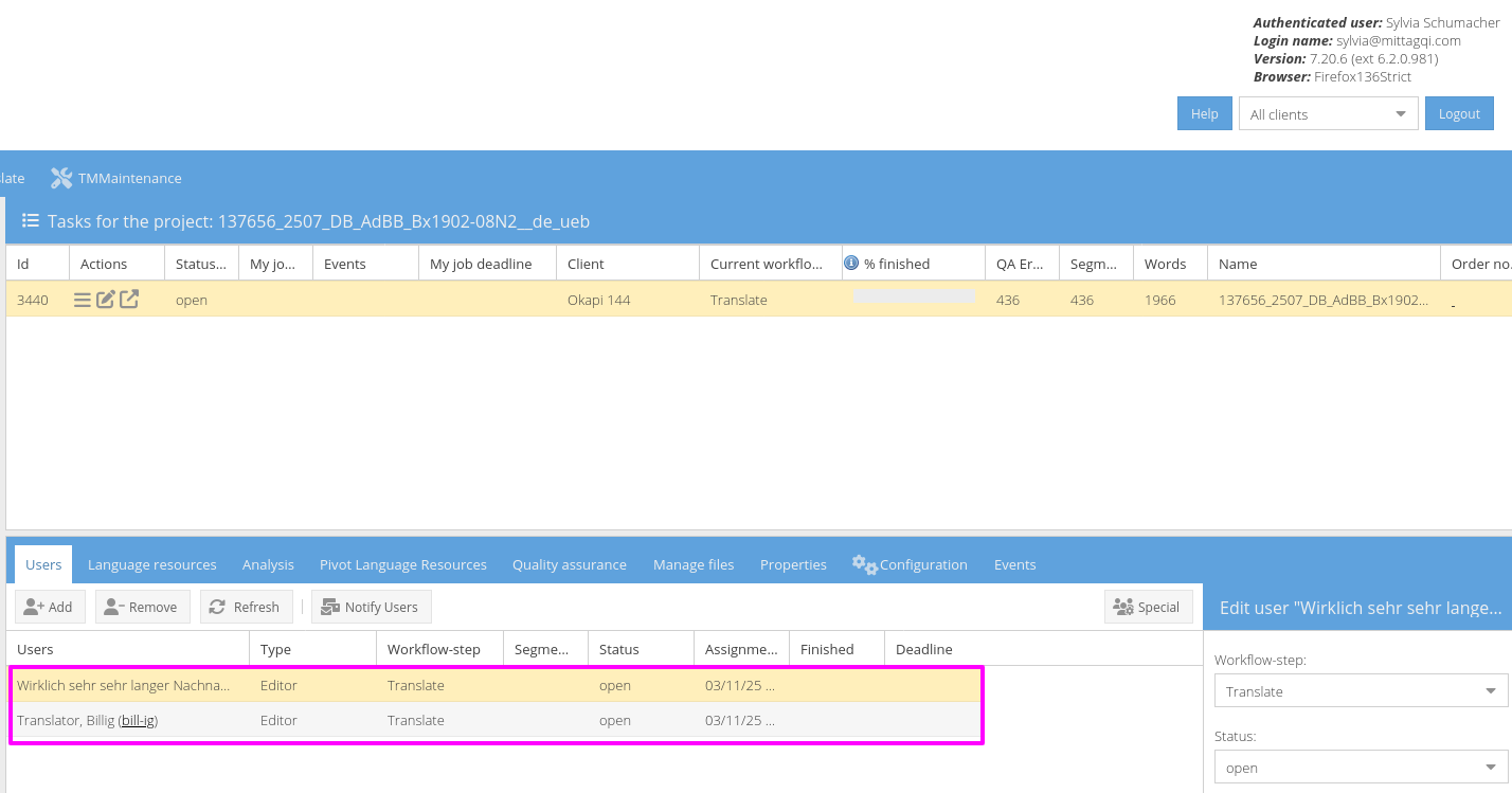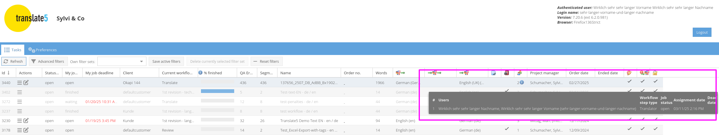 Shod again anonymized "user 1" workflow step translation status open etc on mouseover