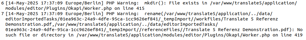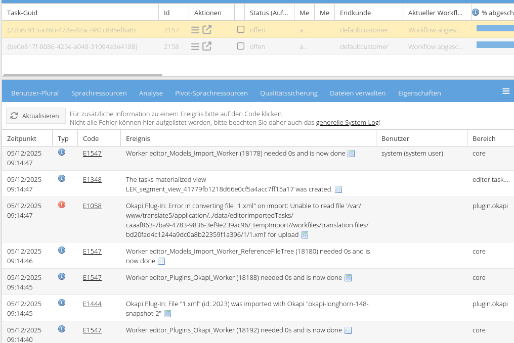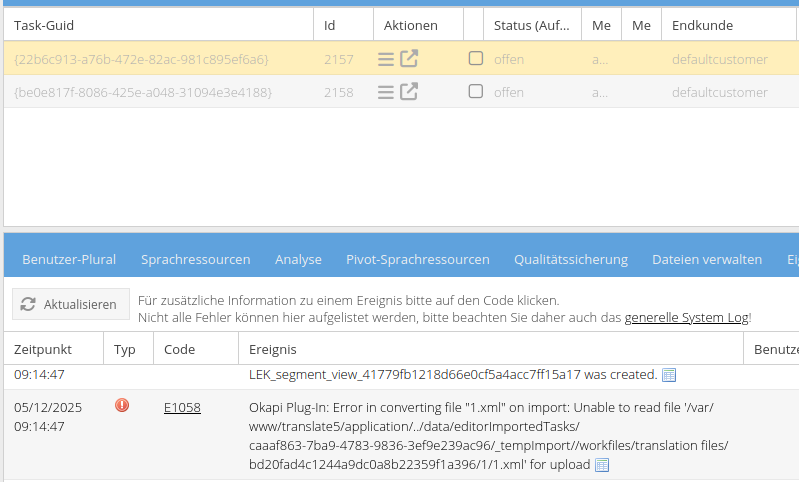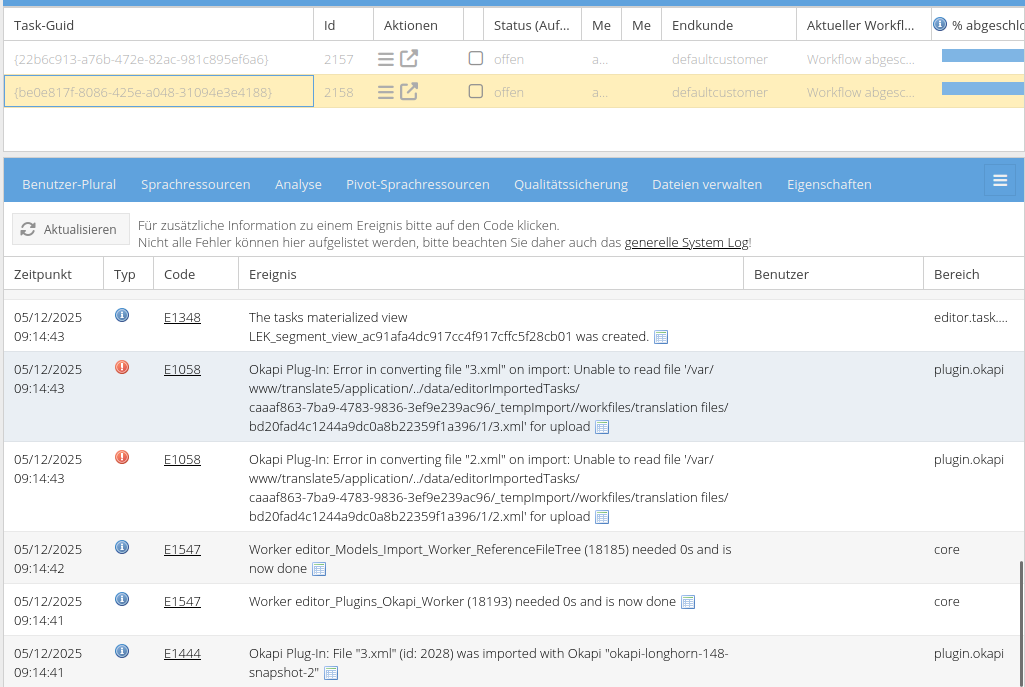 The sample project contains 3 XML files (named 1.xml-3.xml) and 2 target languages so 2 tasks are created for one project. Below are errors which occur within these tasks.