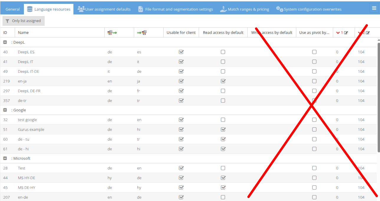 The functionality rembles the functionality of the tab clients->language resources for pre-assignments of resources to tasks. With the differences seen in the screenshot
