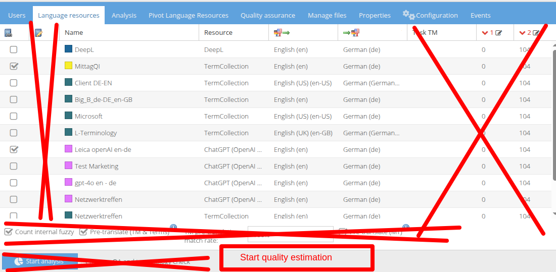 When selecting one of them for creation, a new radio-button alternative appears to be able to select, wether this should be used for translation of quality estimation.