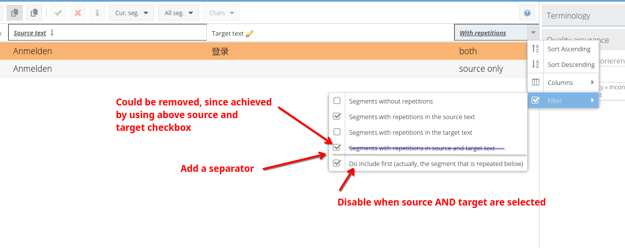 Furthermore using the button for "exclude first repetition functionality" will currently show all other segments listed above, because they are either repeated in source, target or both. For segment no 7 "Log-in" this is not expected from users. They expect all segments where source is repeated (regardless if target is repeated or not).