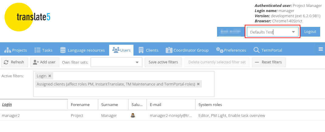 AND: when removing one filter (for example the one of the language resources) then reload / relogin again the just removed filter is set again to the client - even the drop down shows all client. For me its also unclear where the current client is stored, since the user config of the reset grid was persisted empty in the user config table. But from somewhere it got again the previously stored client.