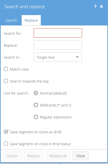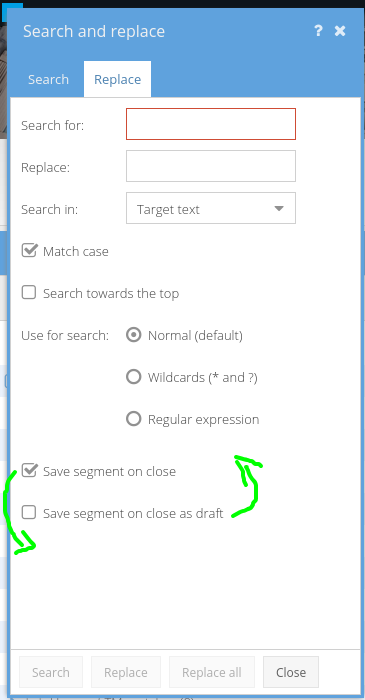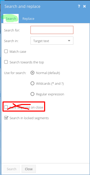In the search tab of the search and replace window in the editor the checkbox "Save segment on close" is misleading. It is used in the replace tab as well.