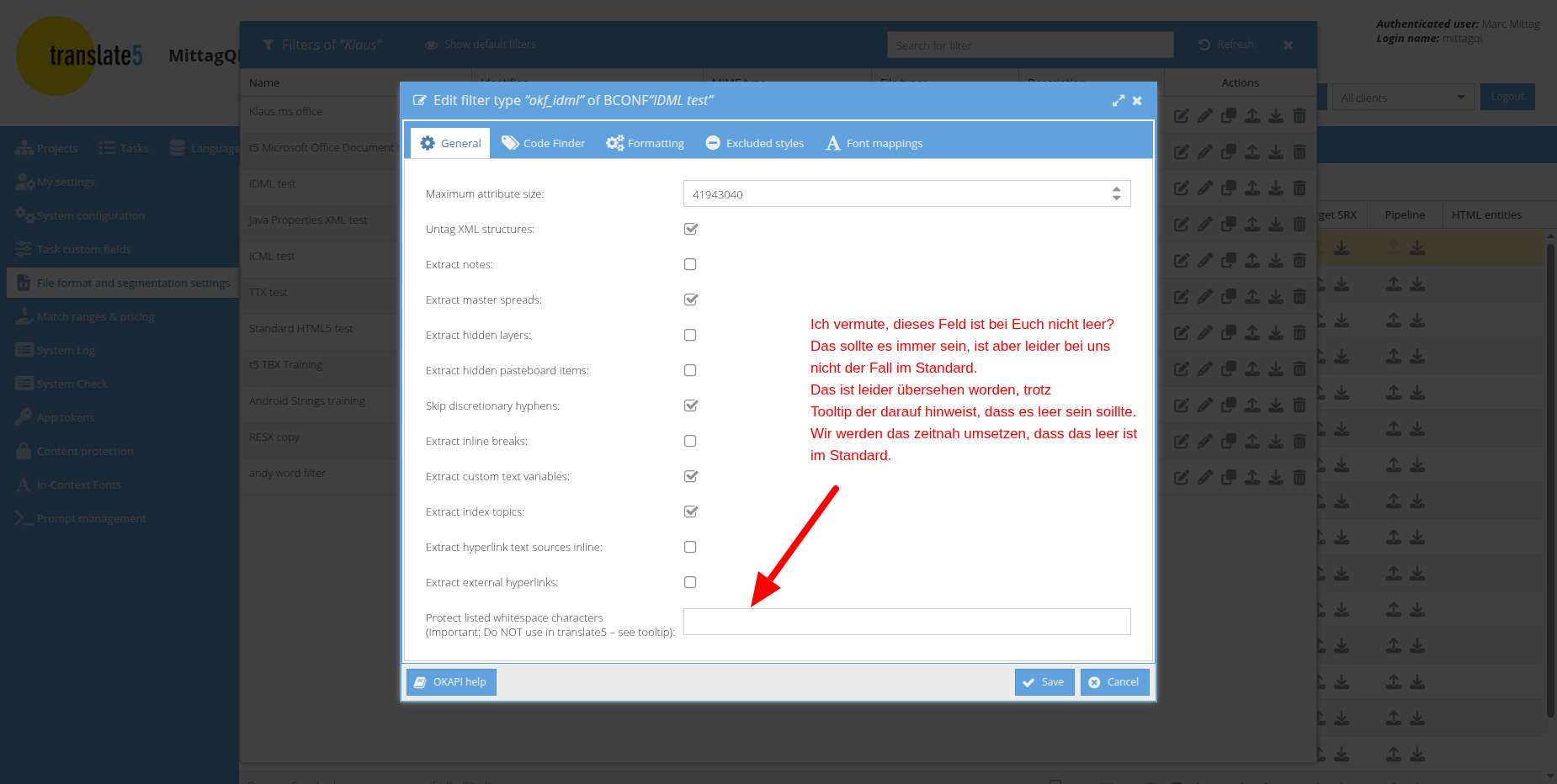 If the field in the screenshot in IDML settings is not empty, special whitespace characters in translate5 are protected as normal tags in translate5 by Okapi.